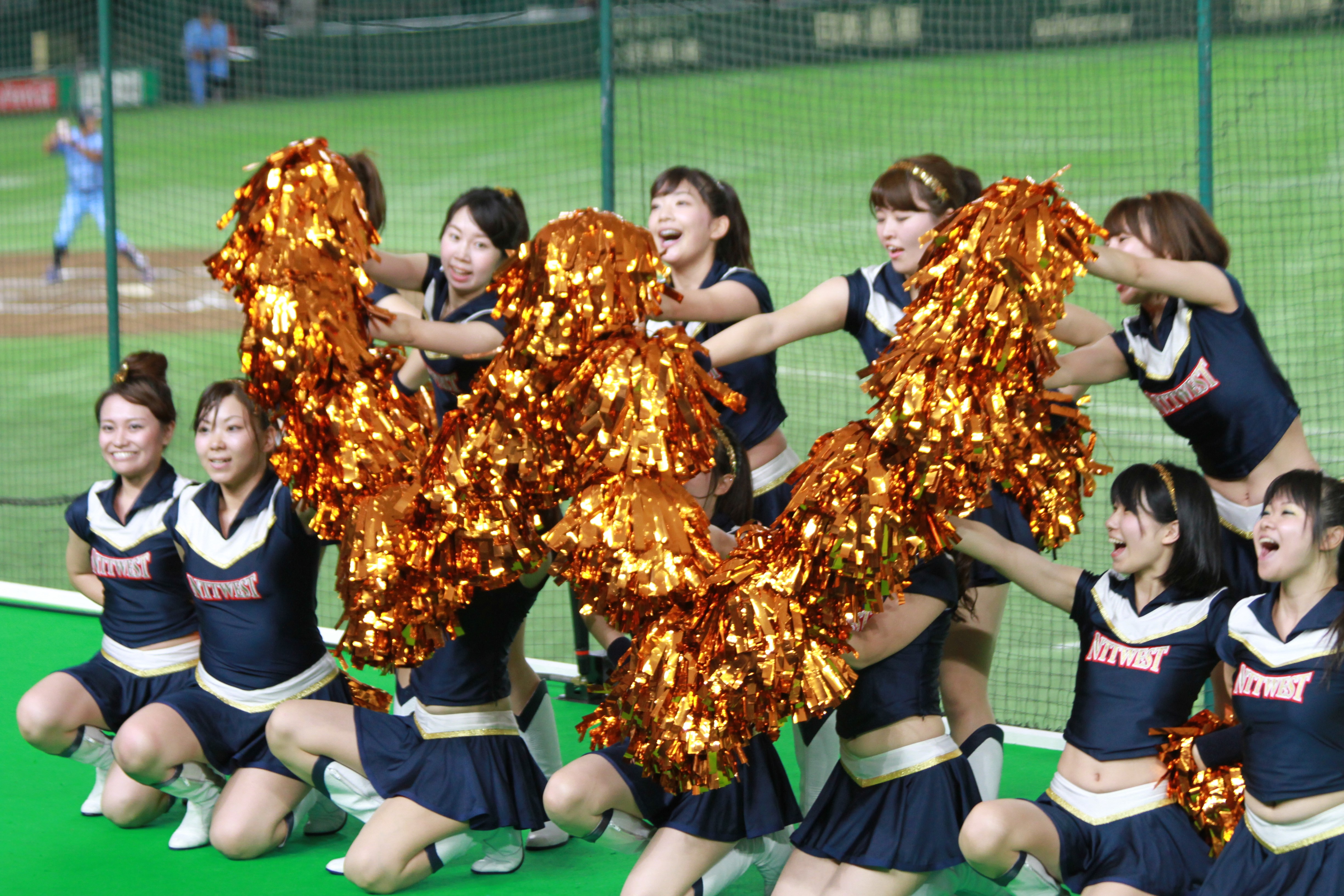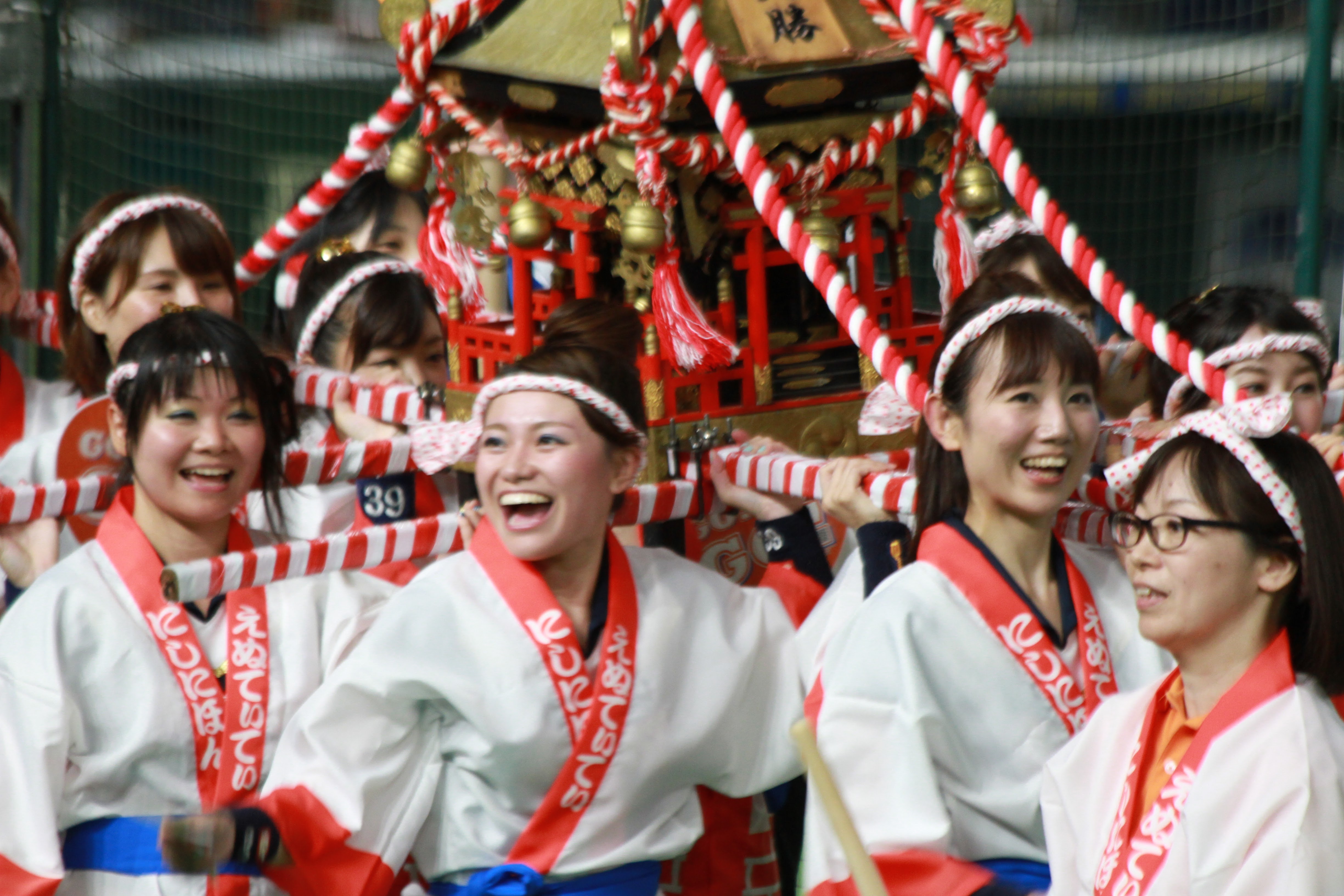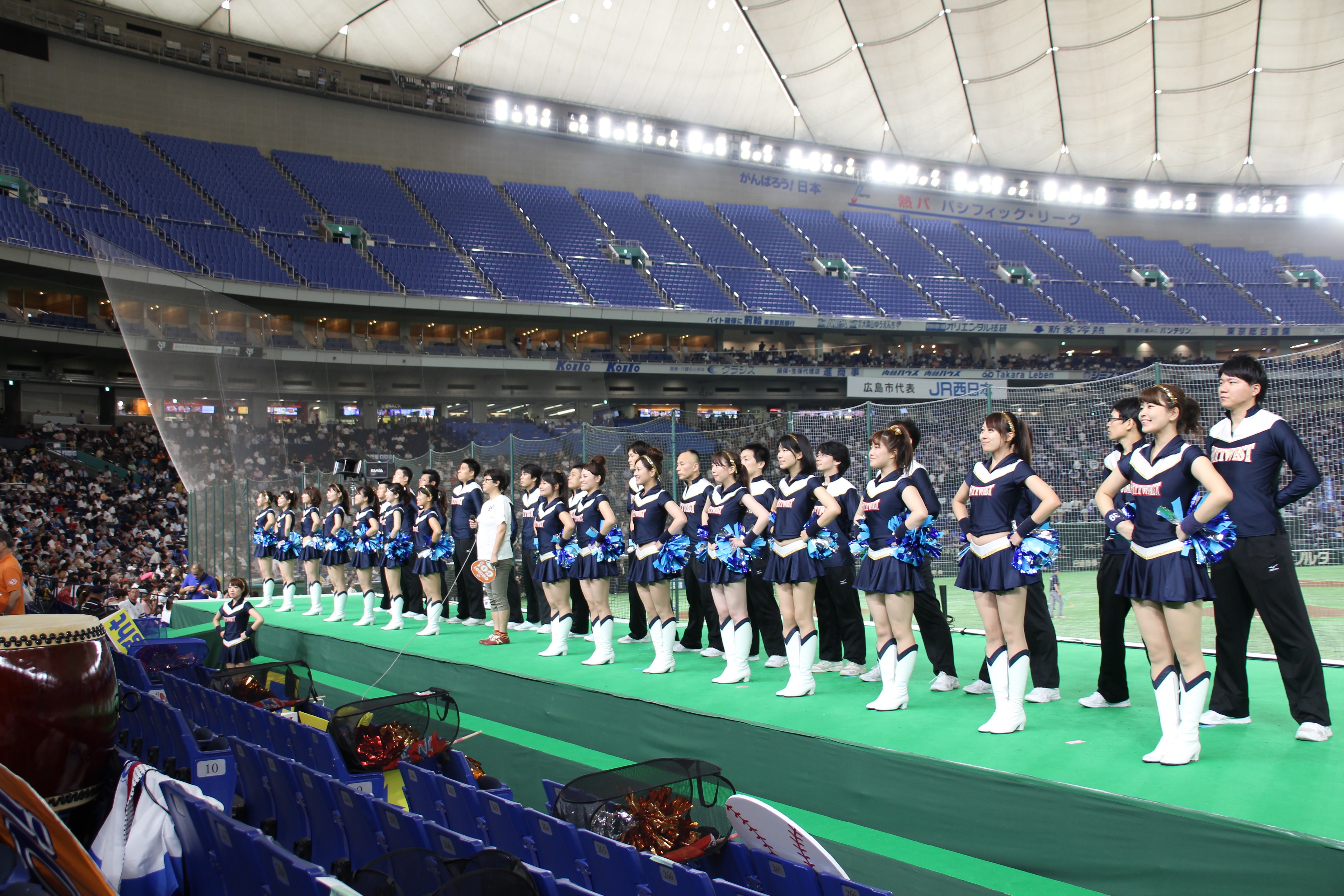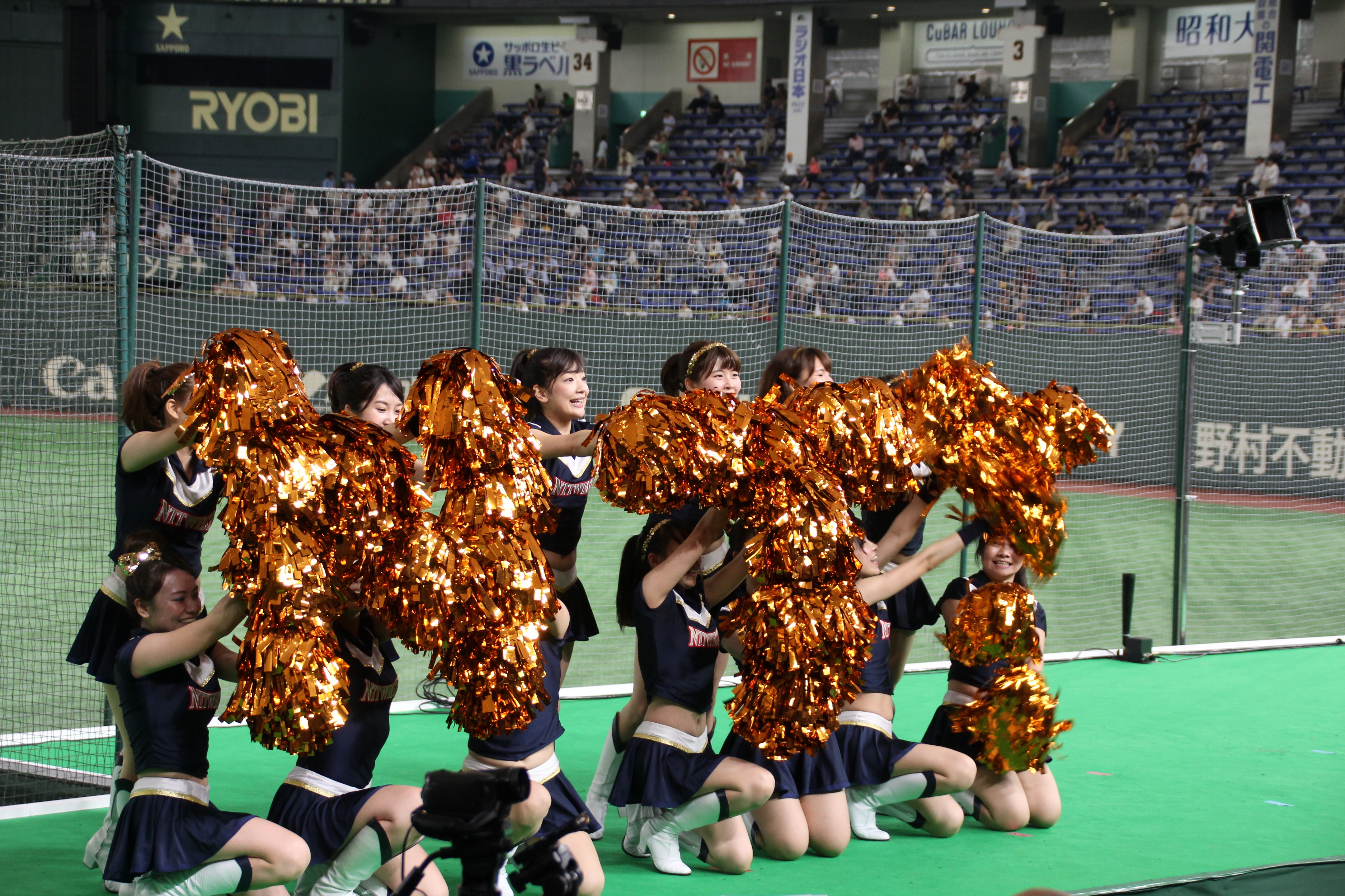 さて、5回はハーフタイムショーです。NTT西日本の応援では、既に毎年恒例となっている「天神祭りギャルみこし」を行い、スタンドを盛り上げました。今年は、去年から更にバージョンアップさせて臨みました。具体的には、みこしの正面に「必勝」の2文字を掲げたり、紅白紐で見た目を豪華にしたり、オリジナル法被を新調したり、担ぎ手であるチアの人数を増やしたり……改善点を挙げればキリがないです。本ブログのトップ画像にもしてありますので、是非ご覧ください!