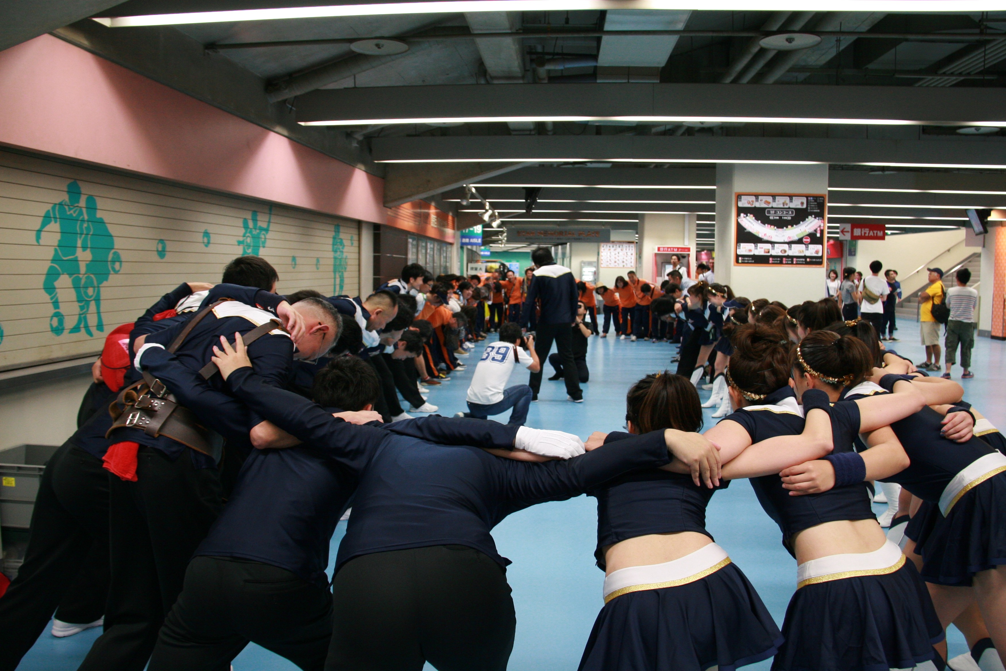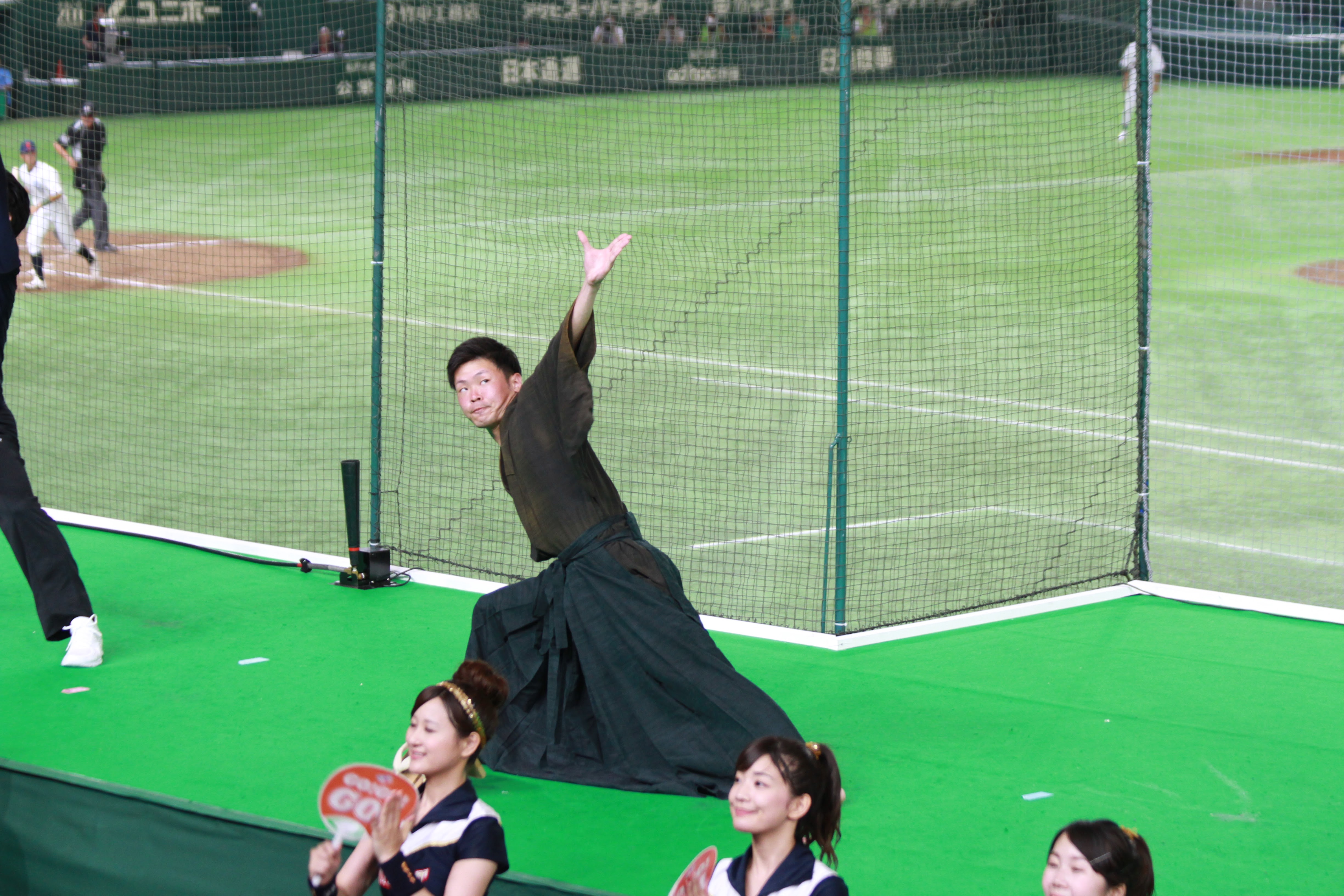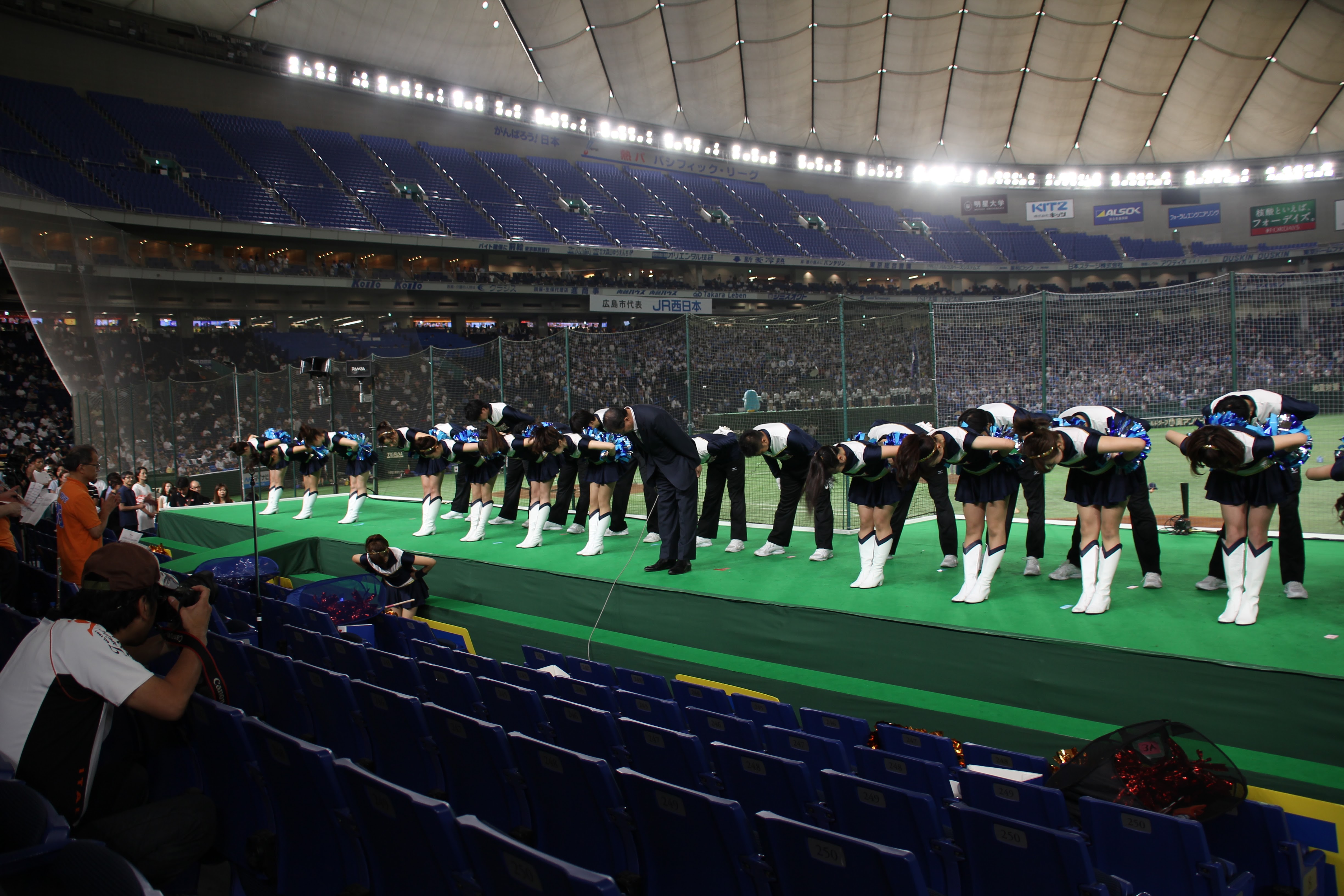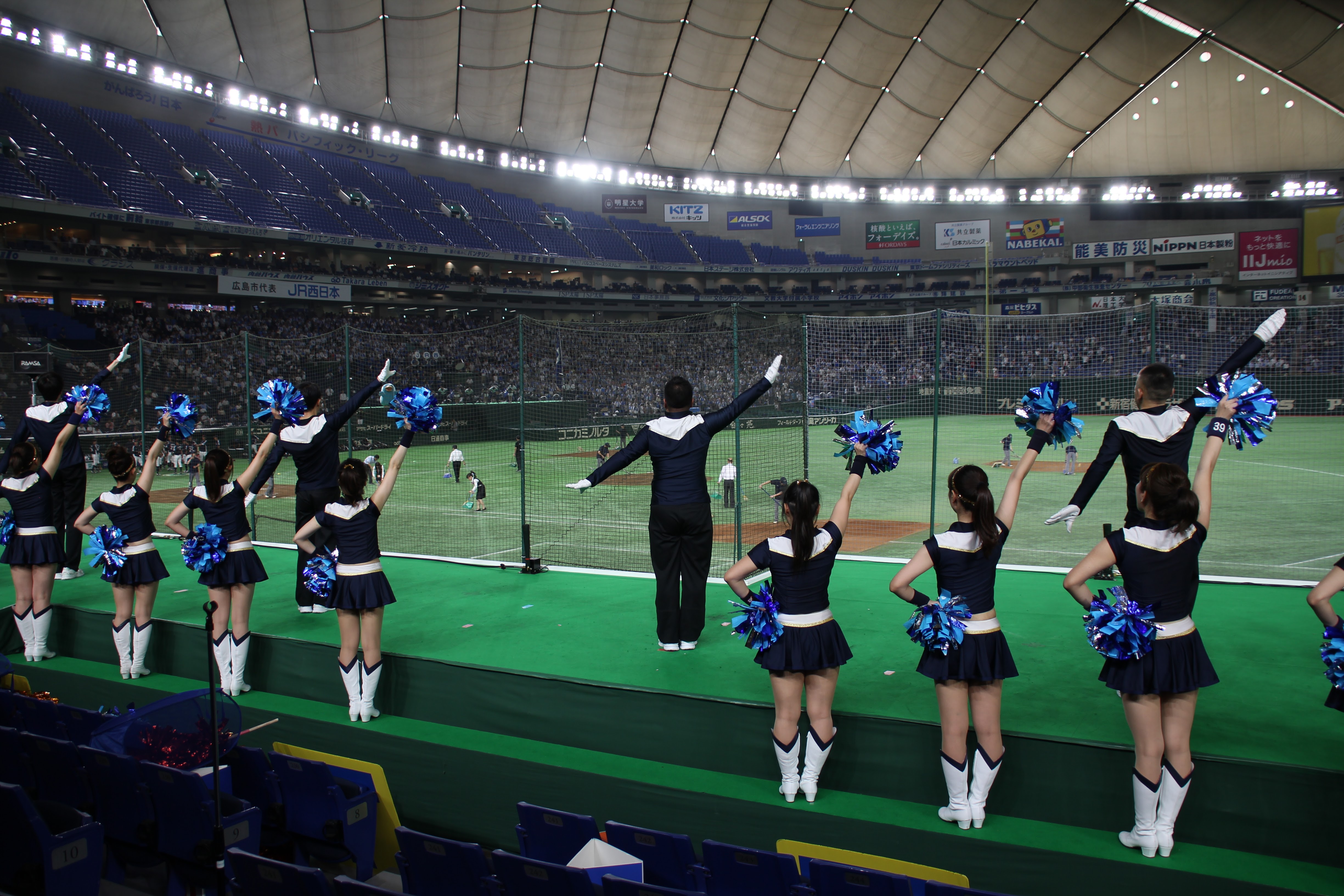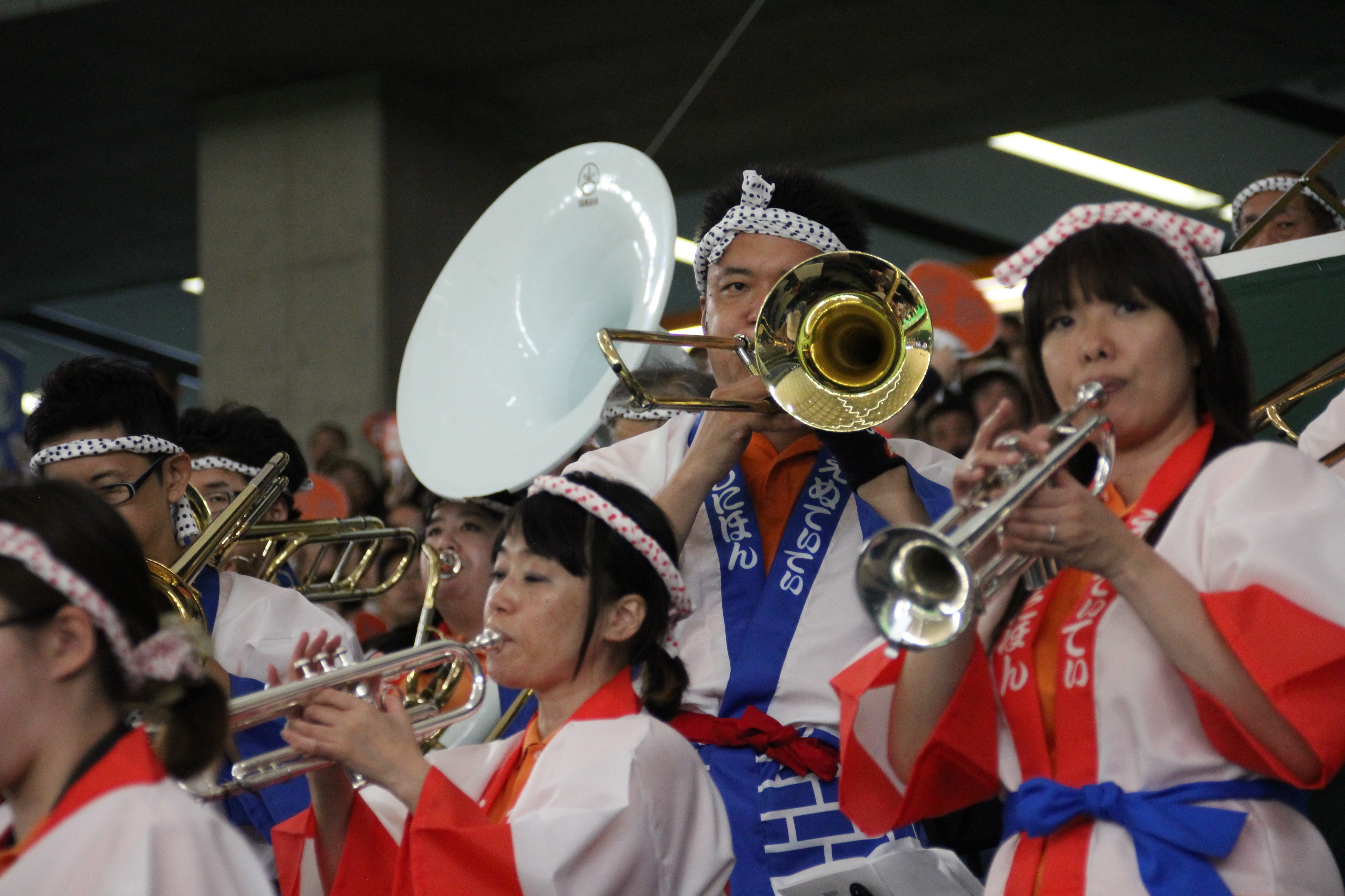 さて、5回はハーフタイムショーです。NTT西日本の応援では、既に毎年恒例となっている「天神祭りギャルみこし」を行い、スタンドを盛り上げました。今年は、去年から更にバージョンアップさせて臨みました。具体的には、みこしの正面に「必勝」の2文字を掲げたり、紅白紐で見た目を豪華にしたり、オリジナル法被を新調したり、担ぎ手であるチアの人数を増やしたり……改善点を挙げればキリがないです。本ブログのトップ画像にもしてありますので、是非ご覧ください!