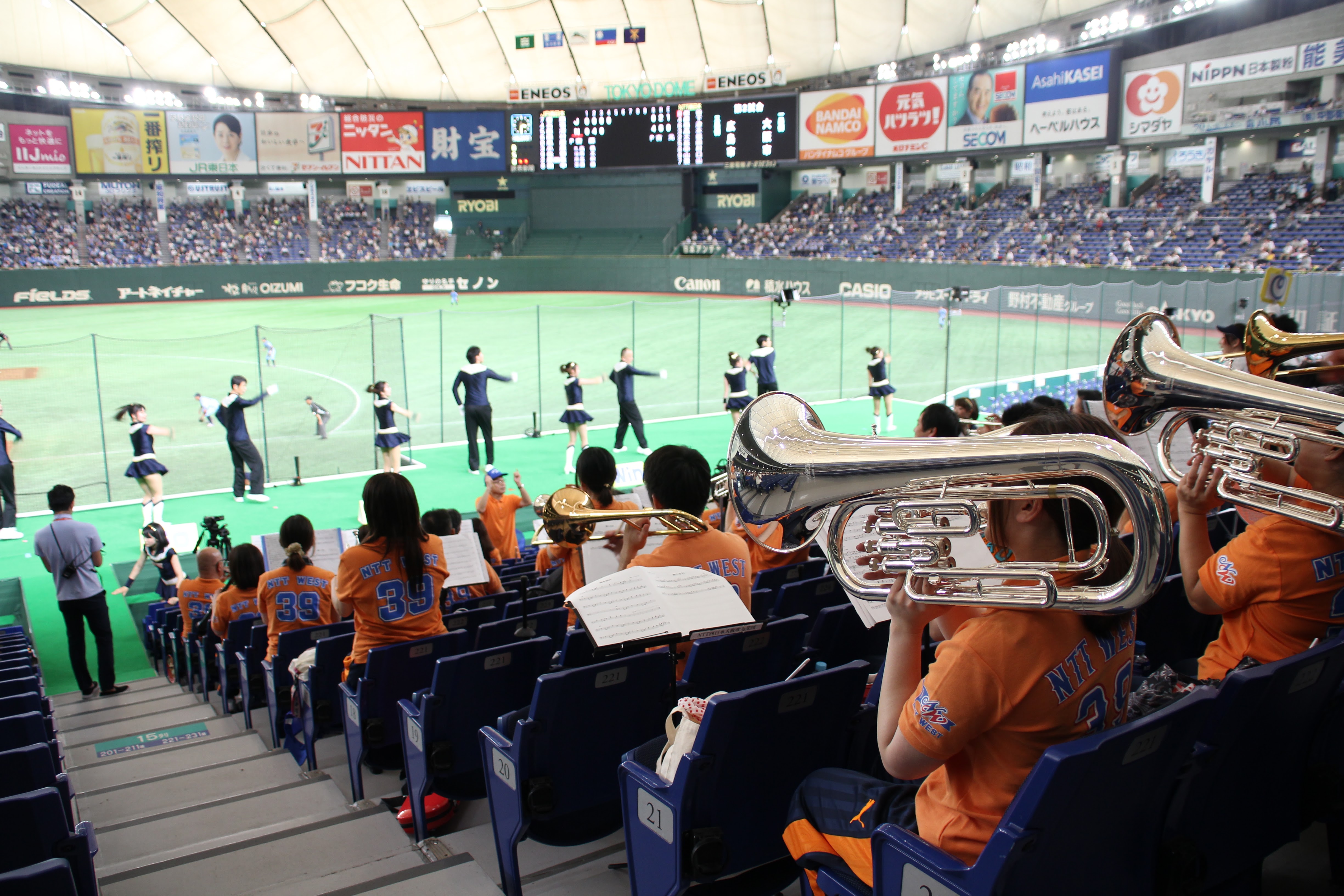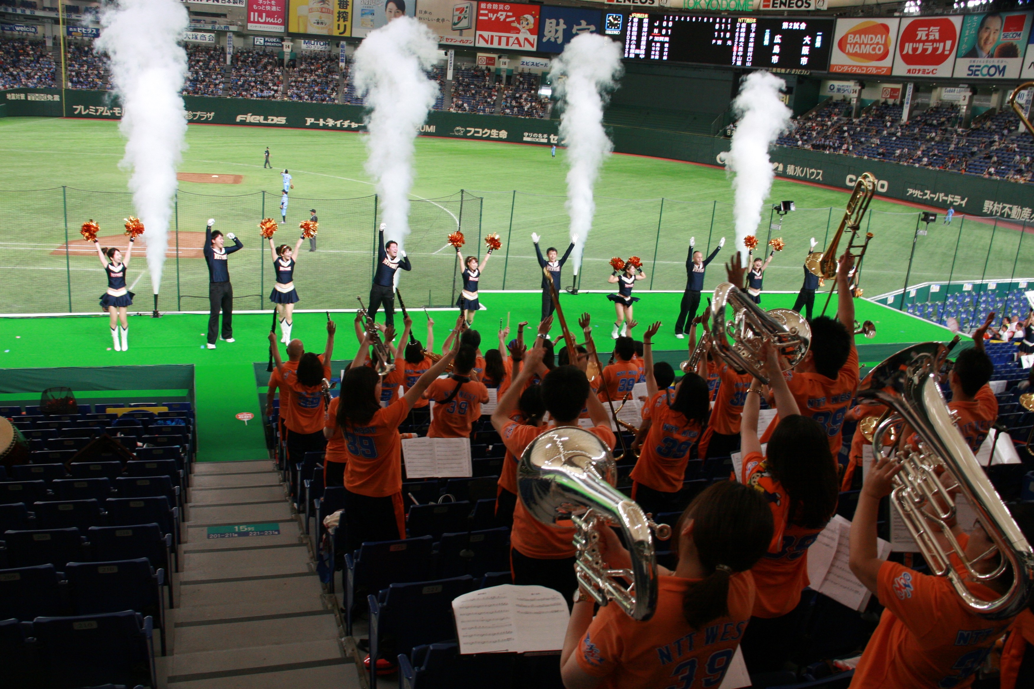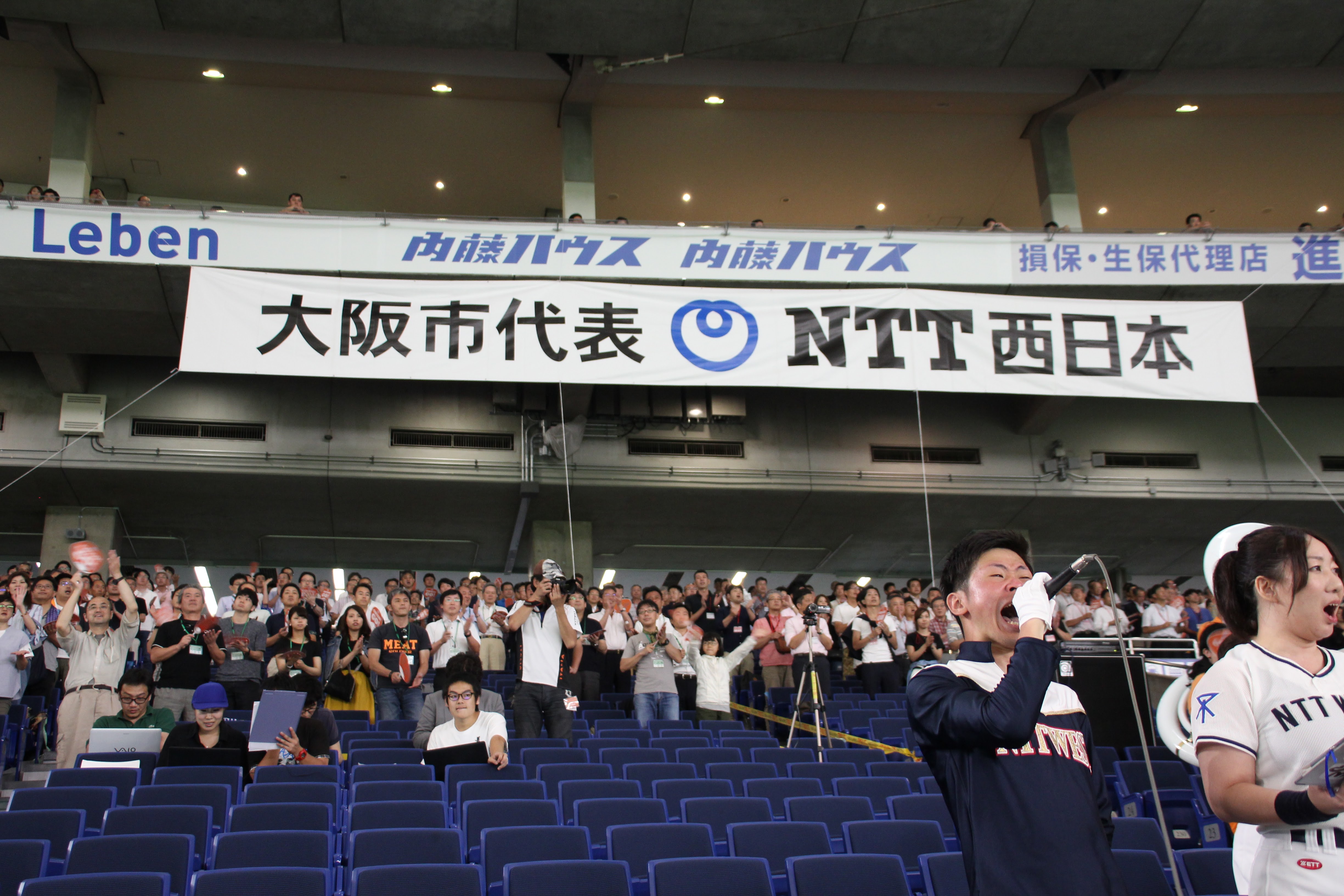 我々の試合は終わってしまいましたが、前述したように、NTT東日本の試合が続きます。我々が負けた分も取り返してほしい一心で、友情応援という形でスタンドを盛り上げるお手伝いをさせて頂きました。