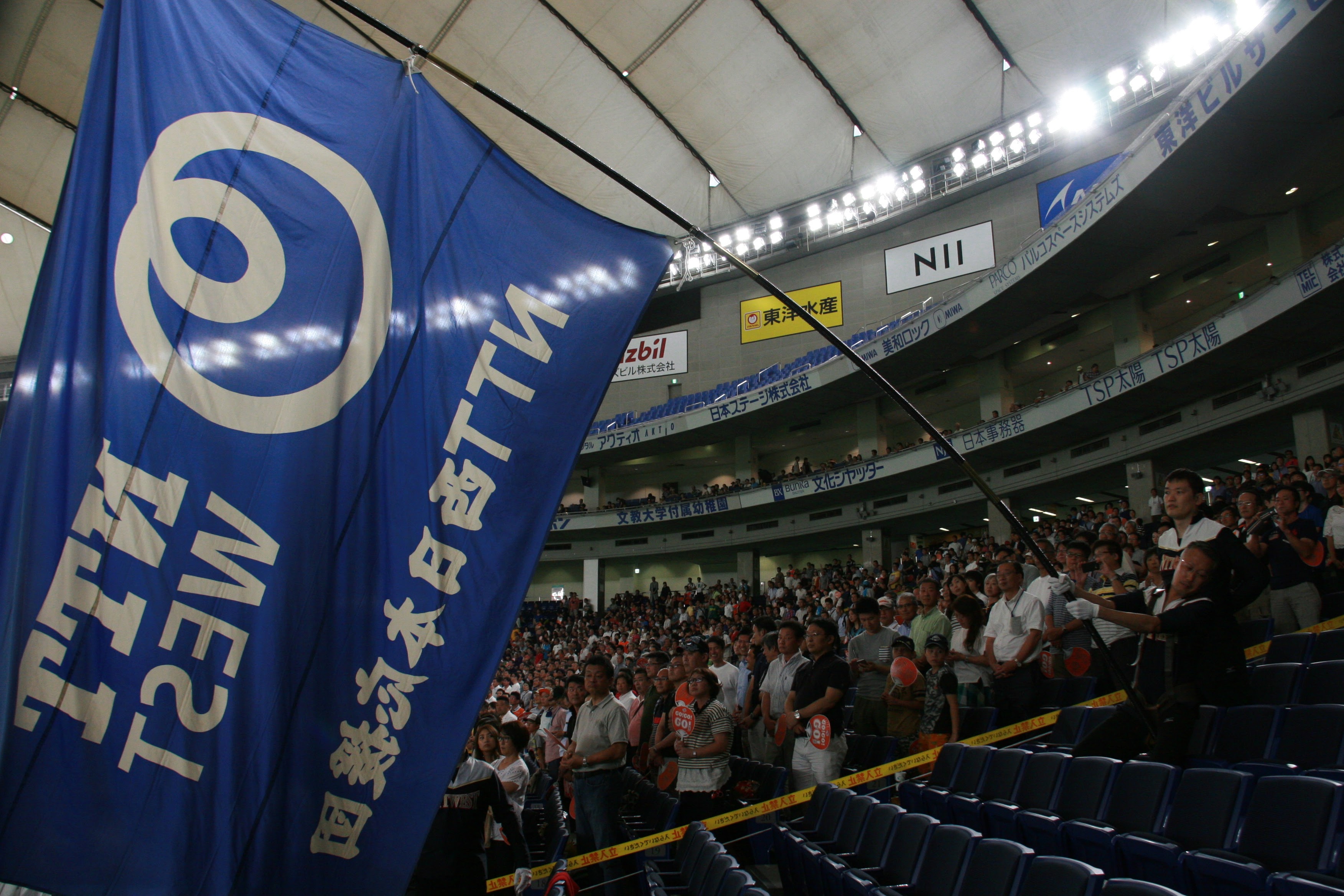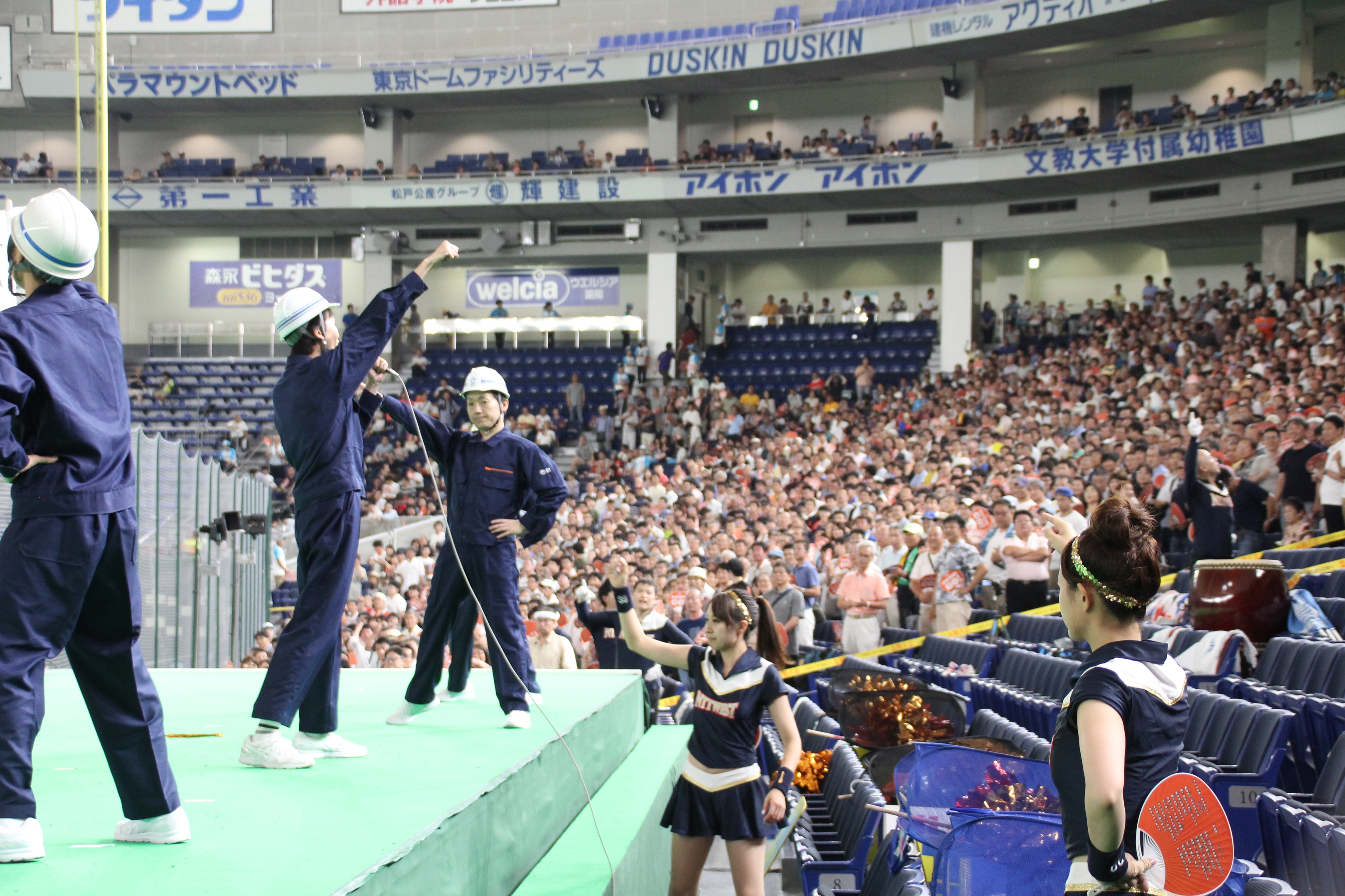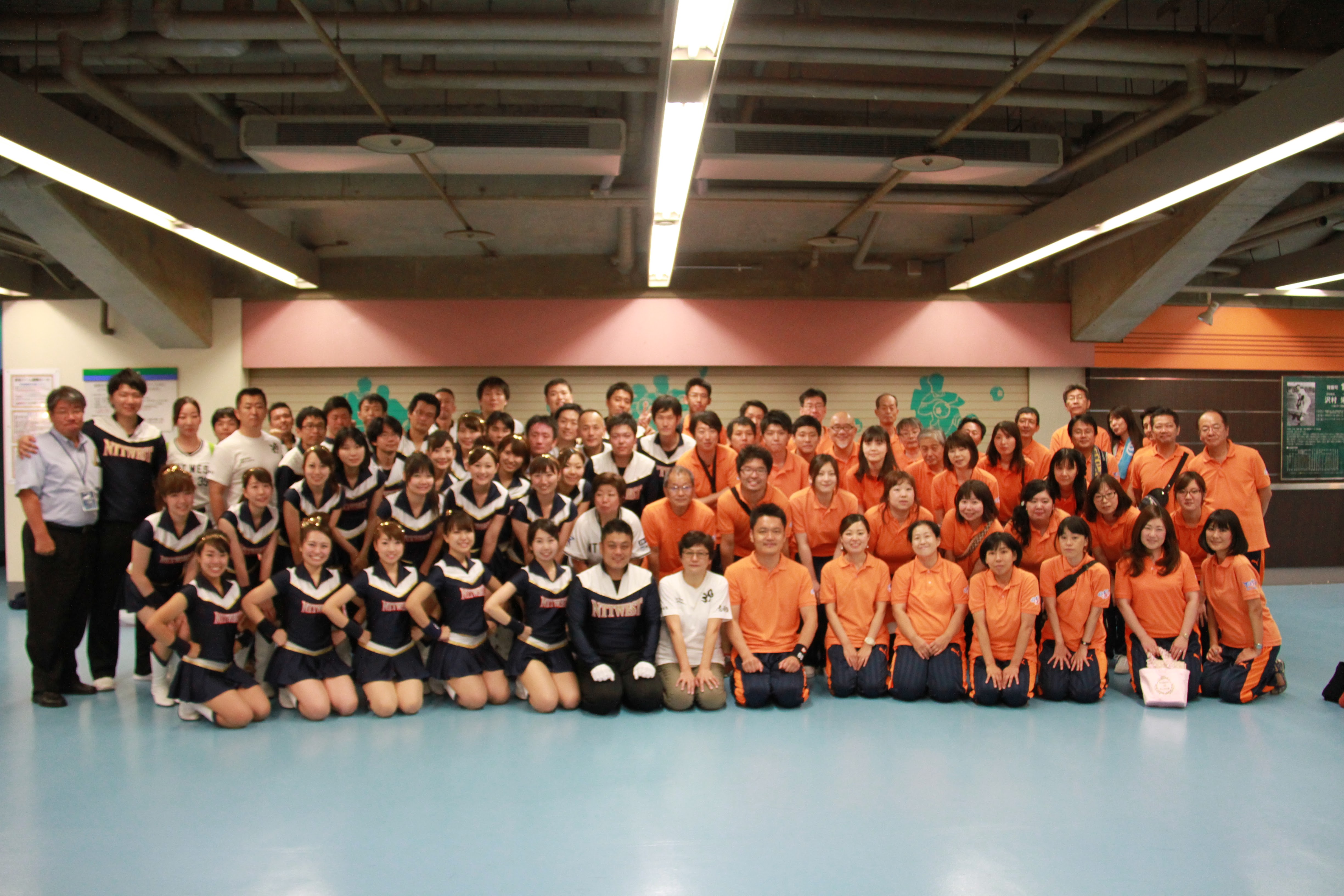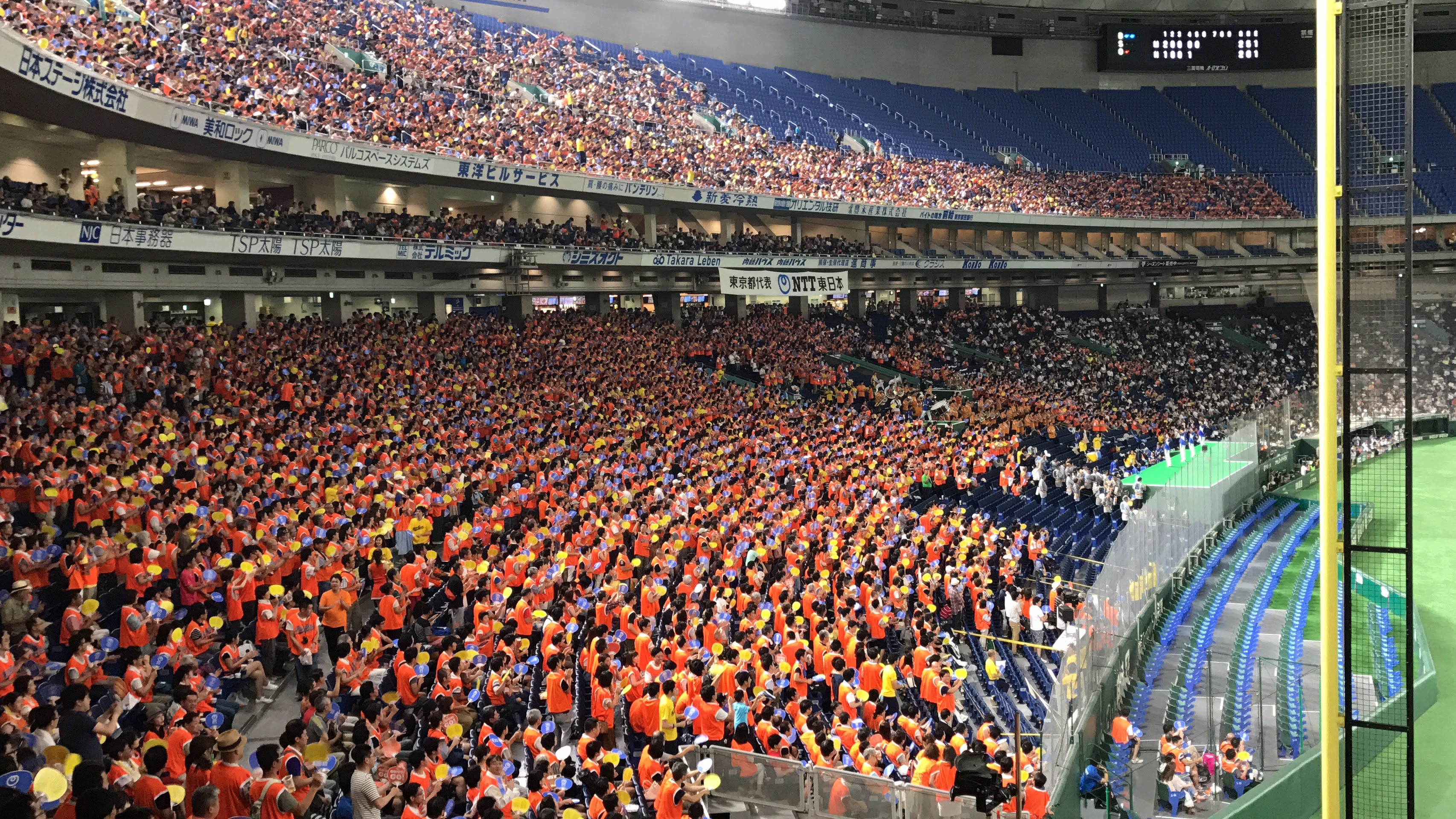 我々の試合は終わってしまいましたが、前述したように、NTT東日本の試合が続きます。我々が負けた分も取り返してほしい一心で、友情応援という形でスタンドを盛り上げるお手伝いをさせて頂きました。