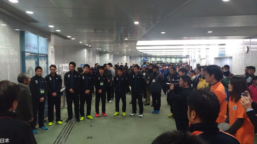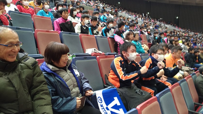 出場した選手は、水澤・村上ペア、丸中・長江ペア、船水・林ペア、岩崎・原ペアの4組。応援席では、選手の直筆サイン入り手旗を振りながら応援をしました。