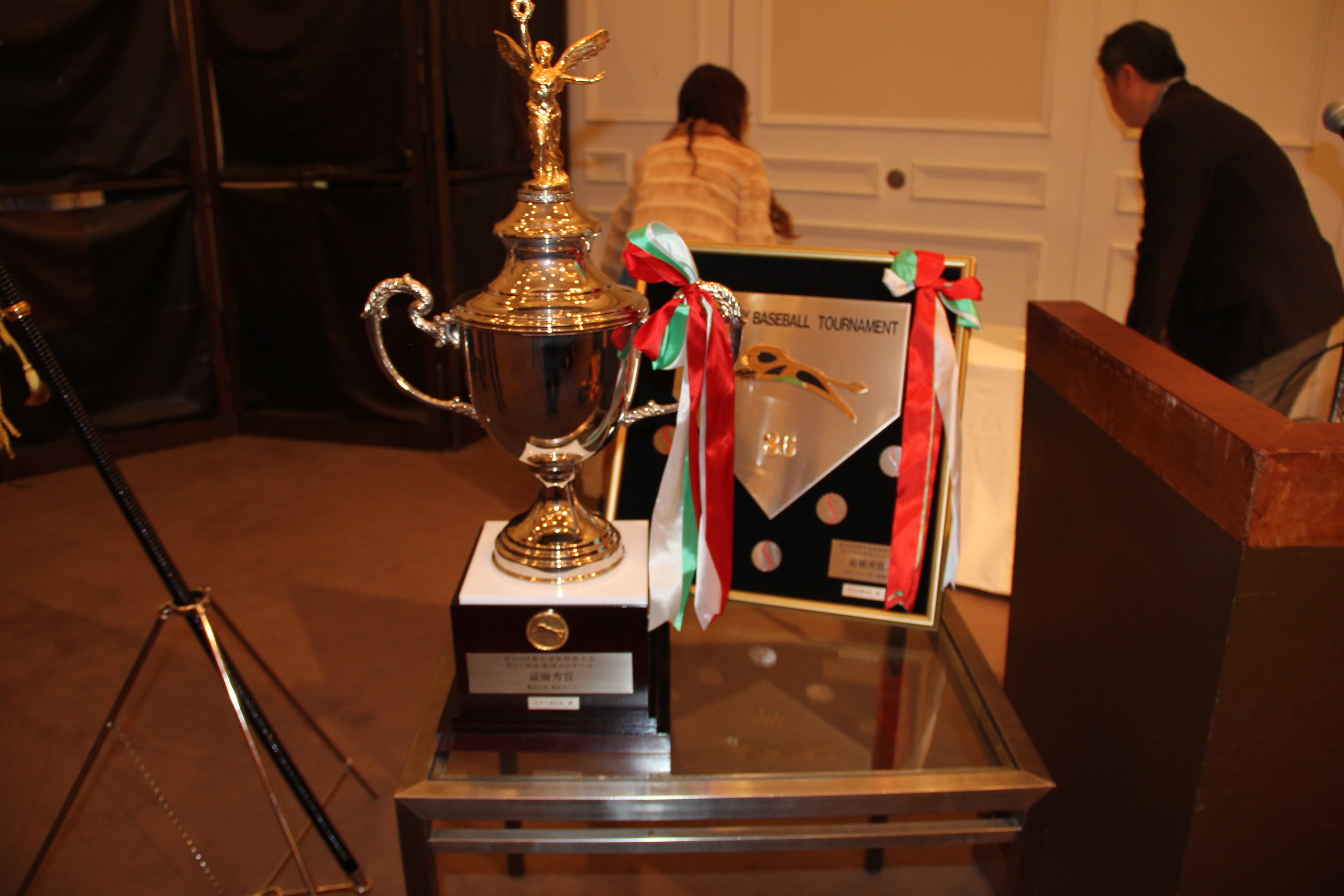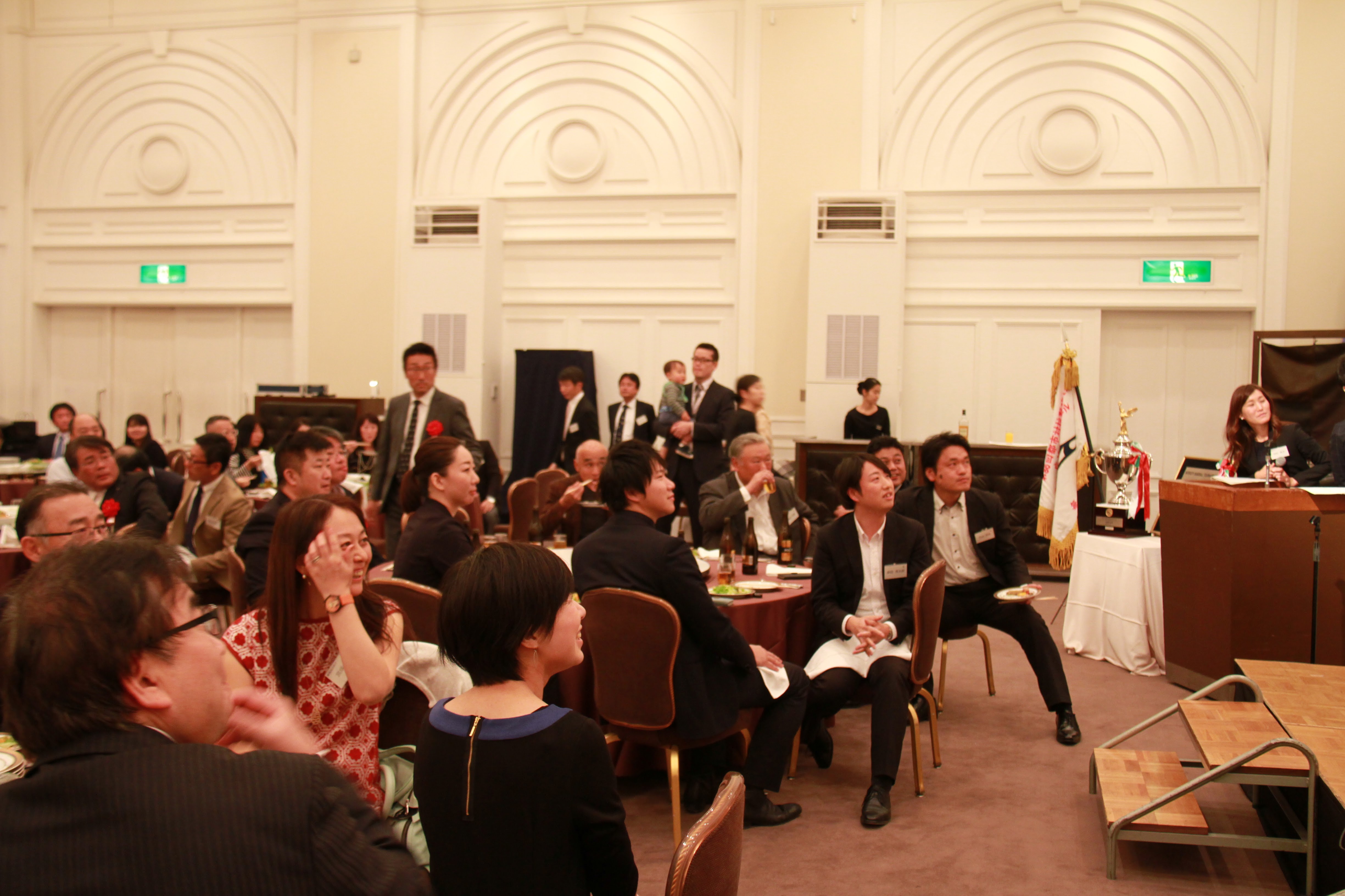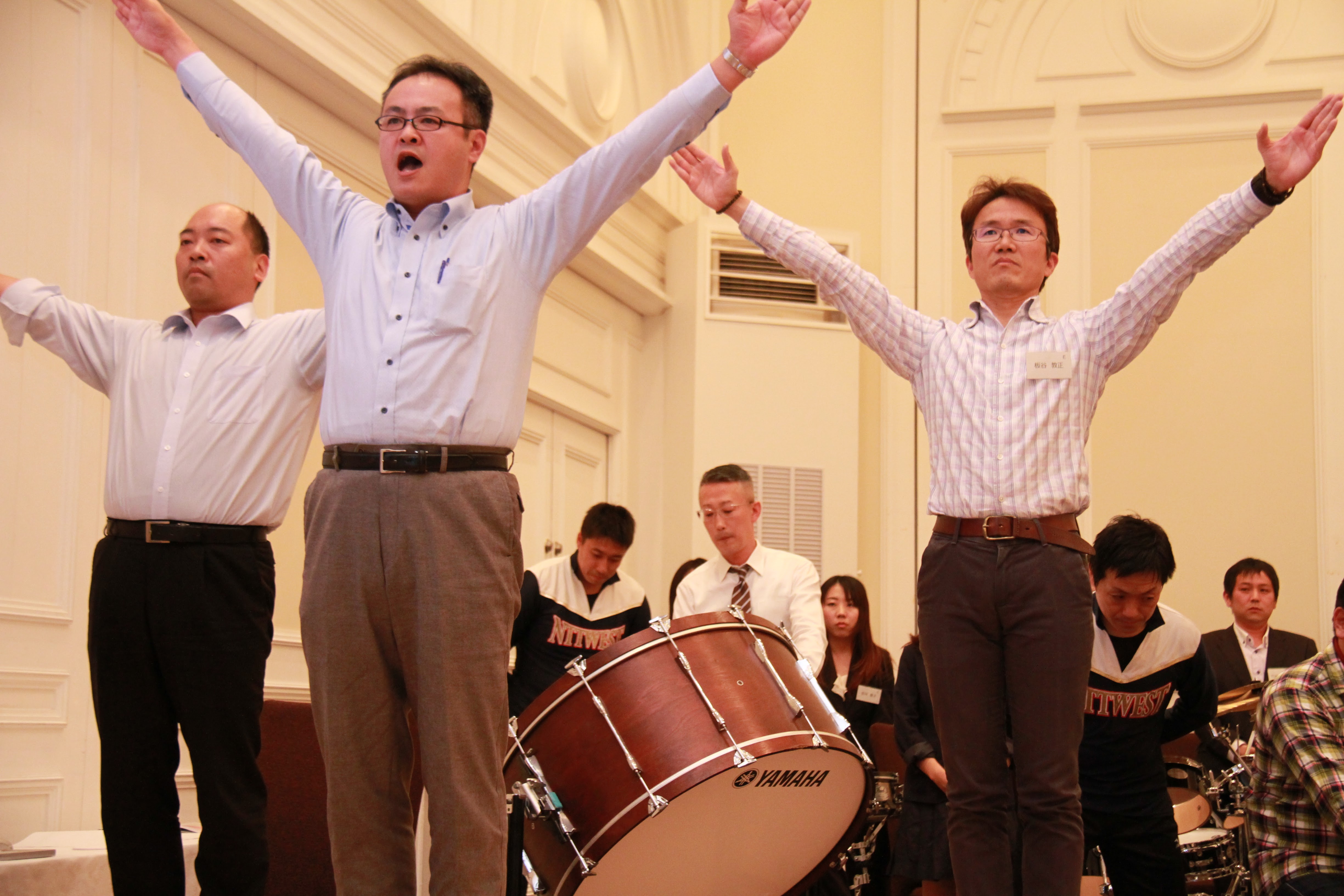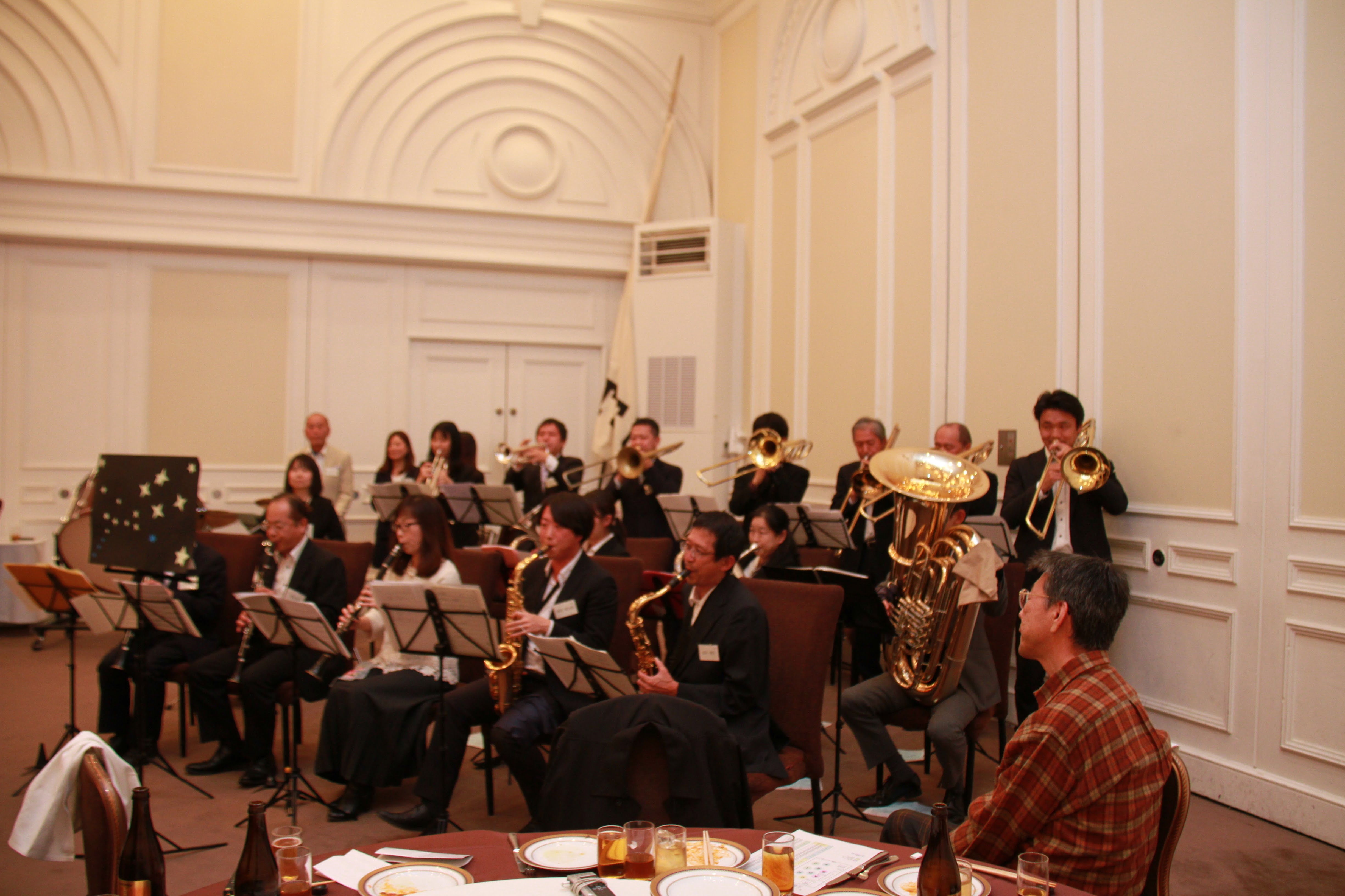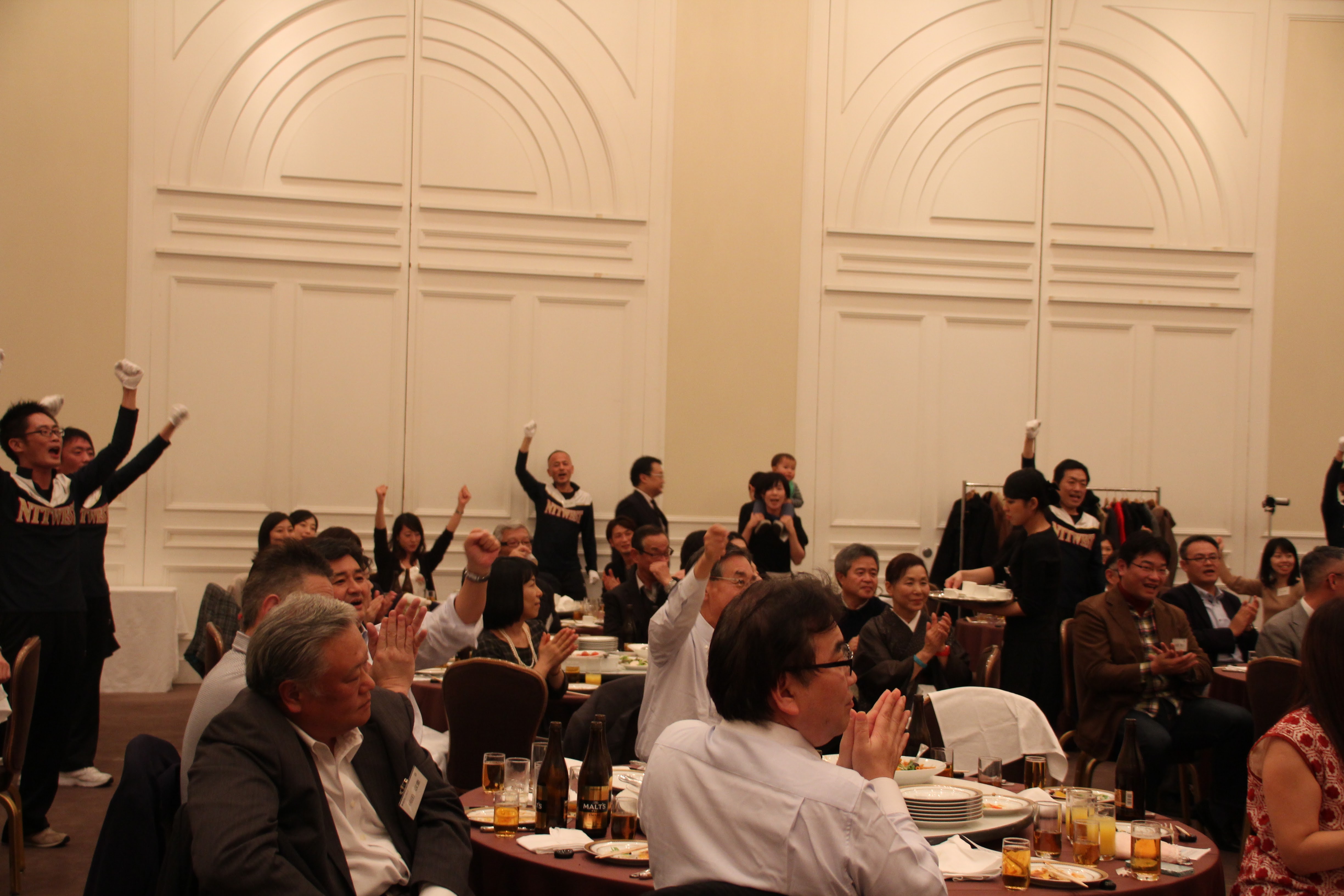 幹事の方々のご尽力により、非常に企画が盛り沢山な会となっており、あっと言う間に2時間が過ぎてしまいました。具体的には、ユーモアに富んだ乾杯の挨拶を皮切りに、まずは第86回都市対抗野球大会で応援部が獲得した「第53回応援団コンクール最優秀賞」のお祝いを頂いた後、OB・OG時代に野球応援で使用していた楽曲の生演奏(赤影、アトム、ミッキーマウス、おたまじゃくし)、続いて現役の応援パフォーマンス(恋のダイヤル6700、スパート、ダイナミックファイターズ)、OBのパフォーマンスを経て、電電公社時代の社歌斉唱、次にNTT社歌(日々新しく)斉唱、最後に現役とOBのエール交換で幕を閉じました。
